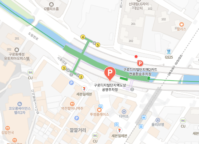 구로디지털단지역 노상 공영주차장은 구로디지털단지역 2번 출구 앞에 있습니다.