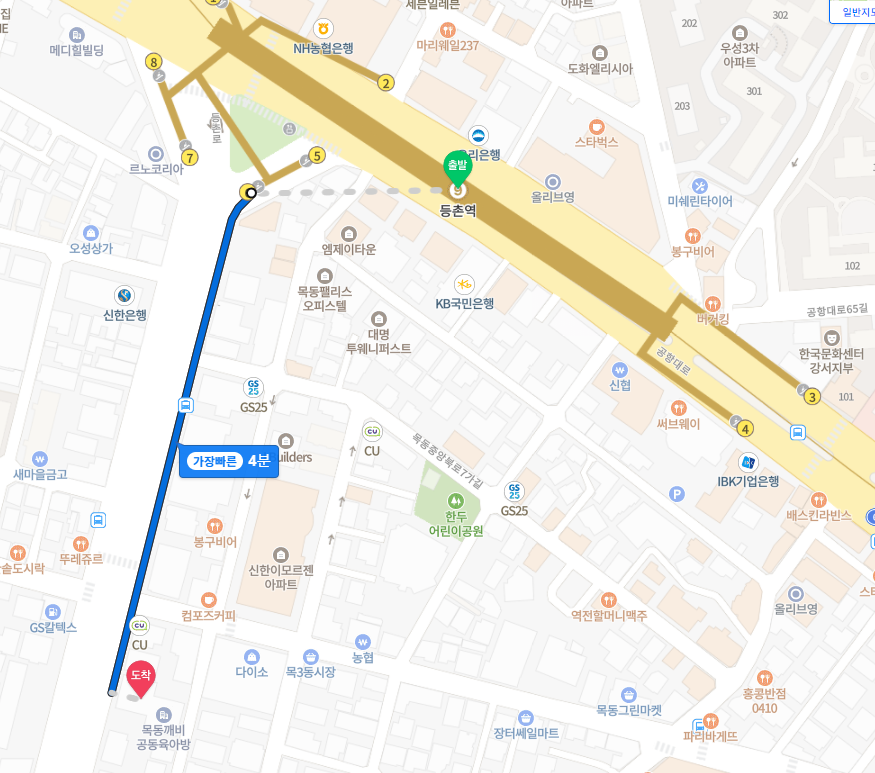 목동깨비시장 주차장은 등촌역에서 약 200m, 걸어서 4분거리에 위치해 있습니다.