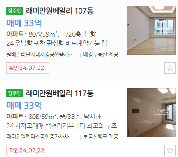 다음은 래미안 원베일리 59. 84 타입 호가입니다.